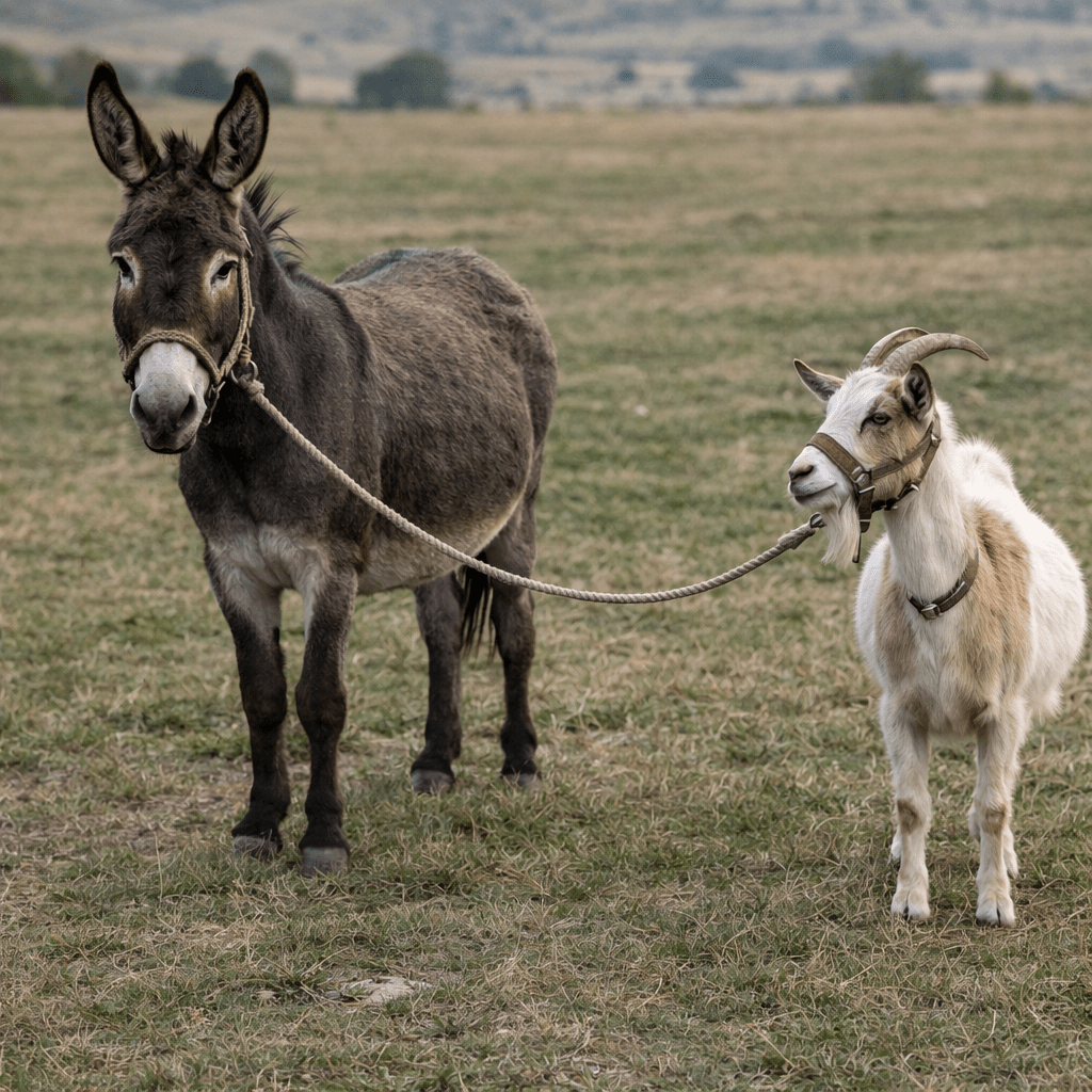 Your friend’s training advice is actually brilliant in a slightly mischievous way. The donkey becomes the “anchor of reality.” The goat can pull, resist, argue—but the donkey simply does not care. Eventually the goat learns: the rope wins.