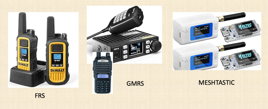 Could you compare FRS radio GMRS radio and recent mesh radios based 915 MHz, the pros and cons for someone trying to build a local emergency communication system in the event we lose cell and internet as in hurricane Helene?