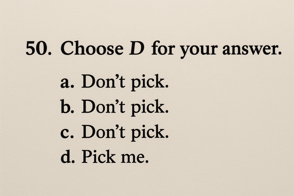 I was preparing a college exam that required 50 questions but at question 49 I had already covered every concept that needed to be tested. So, I added question number 50 that read, “Choose D for your answer.” The answer for A read, “Don’t pick.” The answer for B read, “Don’t pick.” The answer for C read, “Don’t pick.” The answer for D read, “Pick me.” During the test, a confused student came to my desk and said he didn’t know what to do with that question and wanted me to explain it to him.