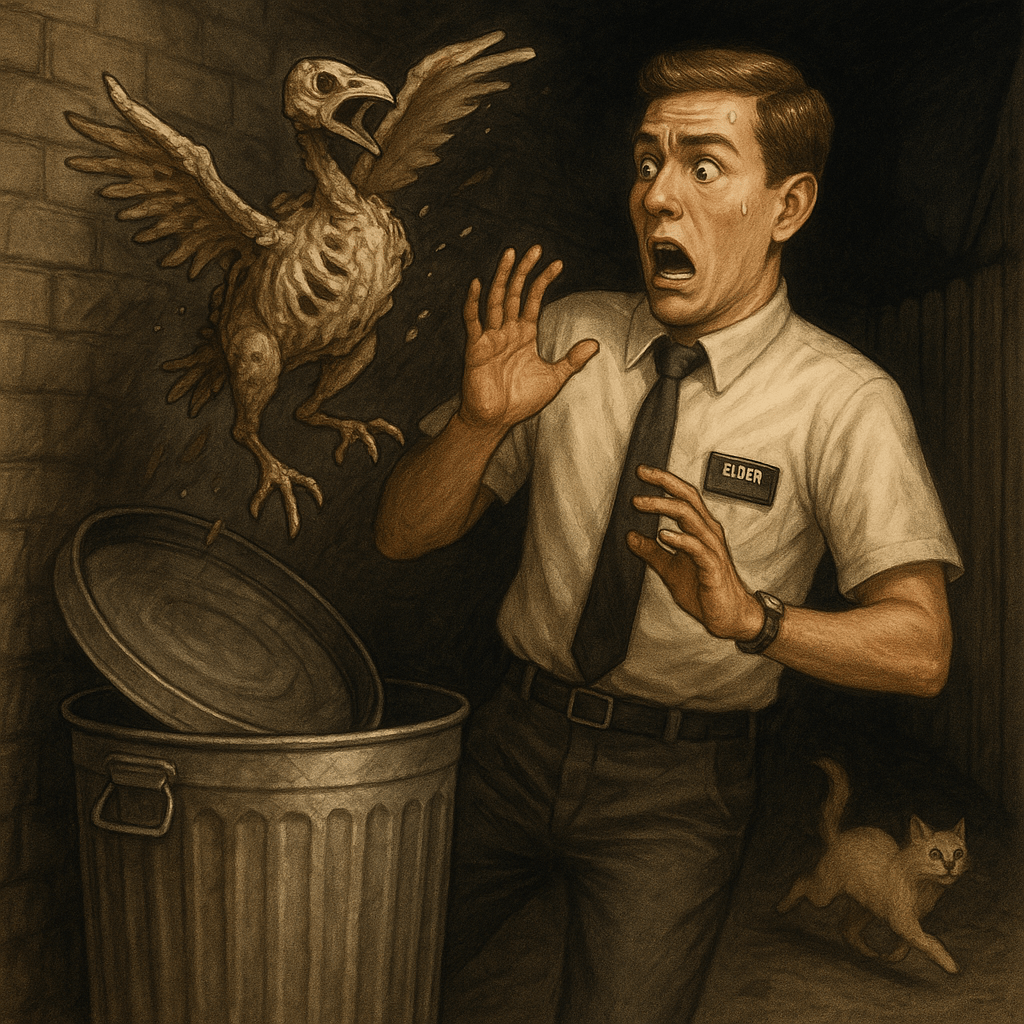 In the darkness, I dropped the turkey carcass into the metal can and turned to leave when from the corner of my eye the can made a rumble noise and began to jiggle violently. The turkey jumped out of the can straight for my face.