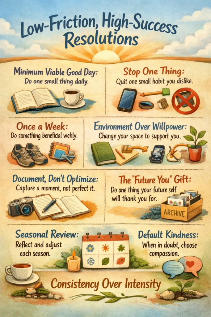 That makes sense—most New Year’s resolutions fail because they’re too big, too vague, or too detached from daily life. The ones that succeed tend to be small, identity-aligned, and friction-light. Below are resolution-like commitments designed to be easy to keep and still meaningful—especially suited to someone reflective, creative, and long-view oriented like you.