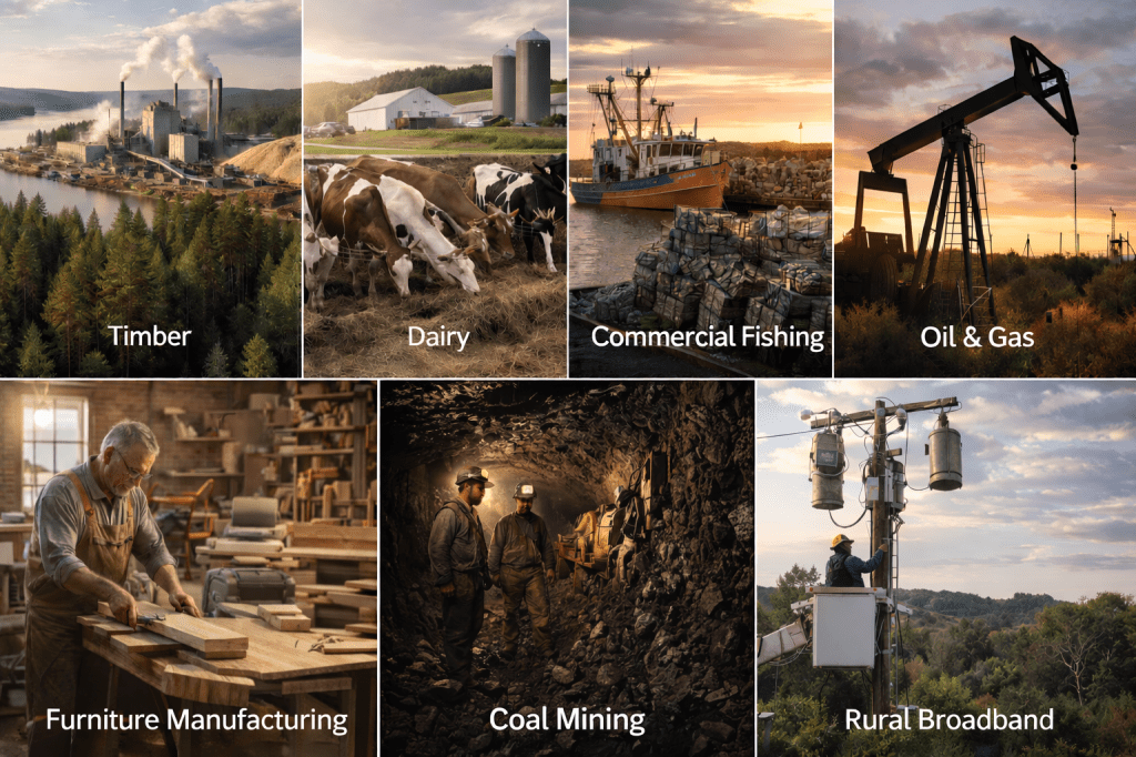 You just summarized a document describing the collapse of the US timber industry. Are there any other industries in the US that are similarly stressed?