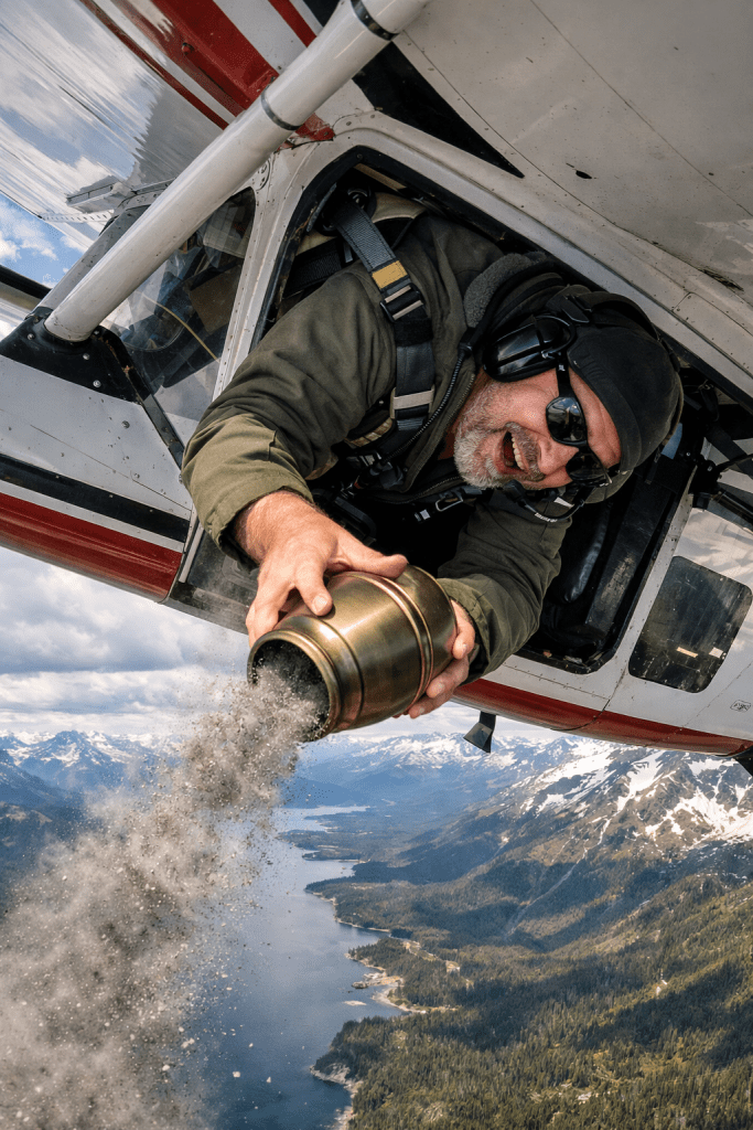 Open plane â open urn â gravity pulls ashes down â respectful trail â Alaska receives its own