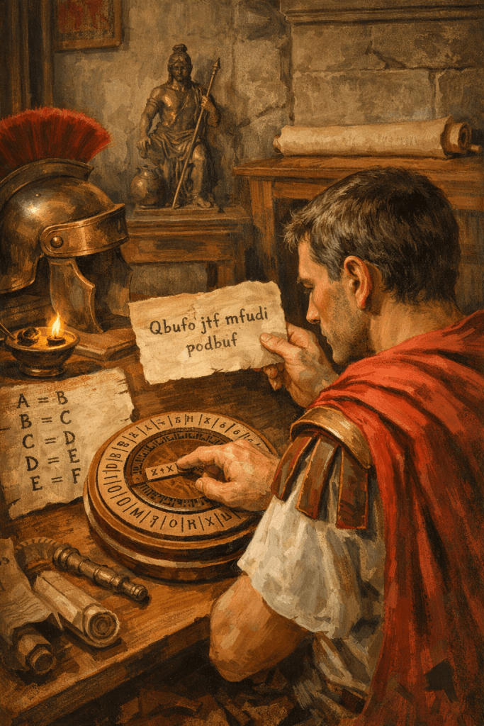 Could you generate an image of a roman encoding or decoding a secret message using this cypher?