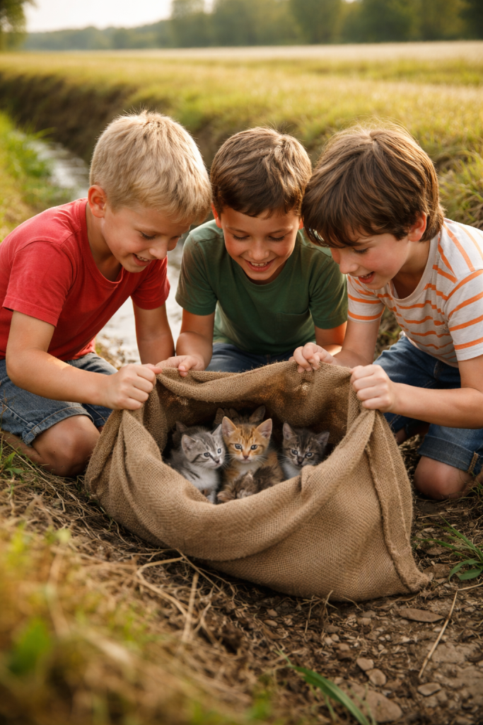 But around that same time—possibly the very same day—you and your friends were walking along that same ditch and discovered a burlap sack with kittens inside that had just been thrown. Whoever tossed the sack had overshot the water and landed it on the bank instead. You boys opened the sack and rescued them.