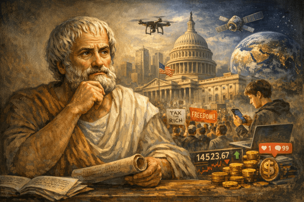 So this isn’t Aristotle reacting to headlines—it’s Aristotle’s framework applied consistently to modern conditions.